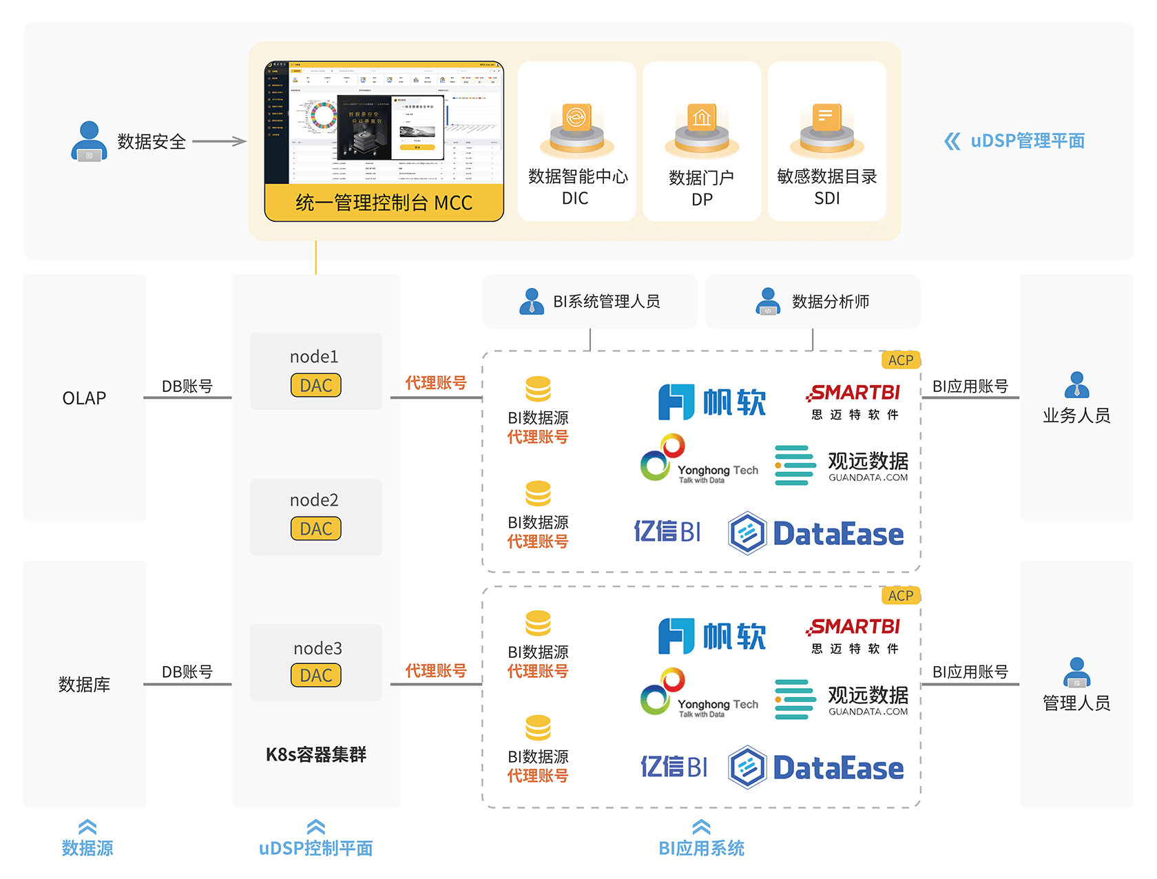 BI 系统的数据分析成果开放给企业更多的业务人员使用,才能更加充分地释放数据的价值。但是,如果不能基于业务人员的 BI 系统应用账号便捷地实施细粒度的数据动态脱敏、行级数据控权、数据访问合规审计等安全措施,企业数据管理团队就会担心敏感数据的泄露和违规使用风险,不敢更大范围地开放使用明细报表。